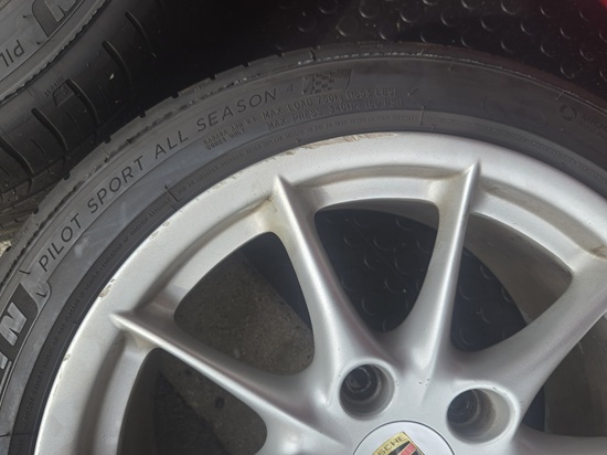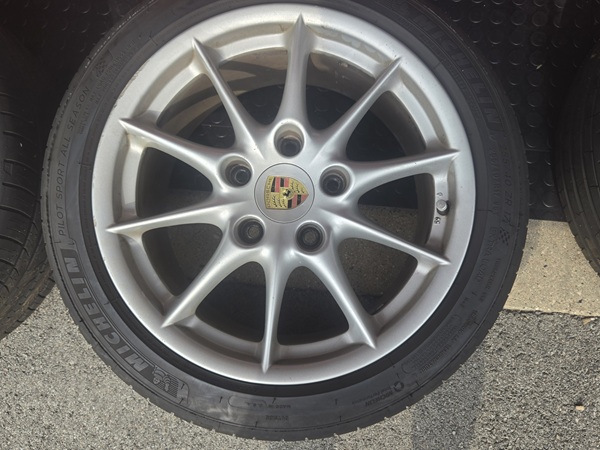 Four wheels off a 2003 Boxster. The tires have decent to great tread though rears are Michelin Pilots AS 2s and the fronts are Continental Extremes. Used 2 times for autocross. I no longer needed the wheels. Two of the four have minor imperfections as seen in photos. Wheels have never been driven in the snow, so there is no salt exposure. Cannot deliver, must pick up and no, I will not ship  $650 OBO.