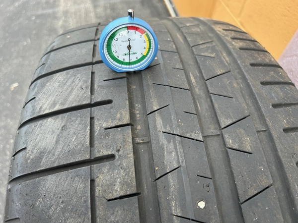 They have Michelin Pilot Alpin tires. The front tires are 235/40 R18 with .275” tread depth and the rear tires are 265/40 R18 with .135” tread depth (legal, but should be replaced).