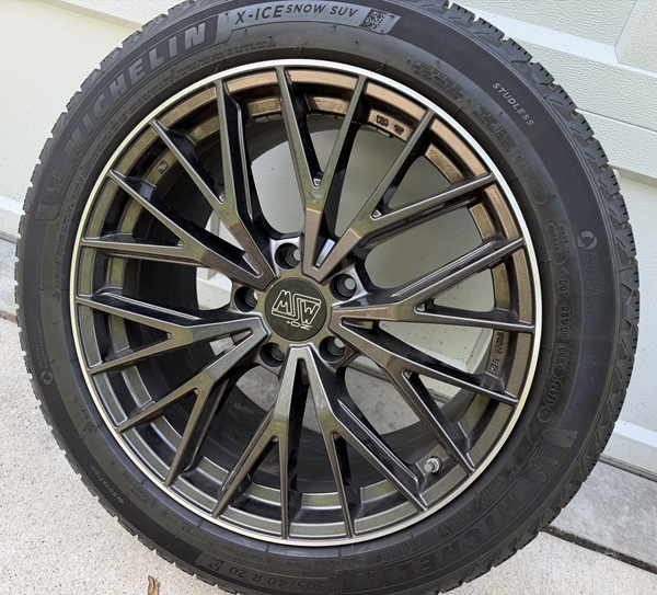 Set of 4 MSW Type 44 alloy wheels with Michelin X-Ice snow tires off my 2022 Cayenne. Gunmetal finish. Front wheels are 20x9 with 275 45 R 20 tires. Rear wheels are 20x10.5 with 305 40 R 20 tires on them. Complete with TPMS. 50mm offset.